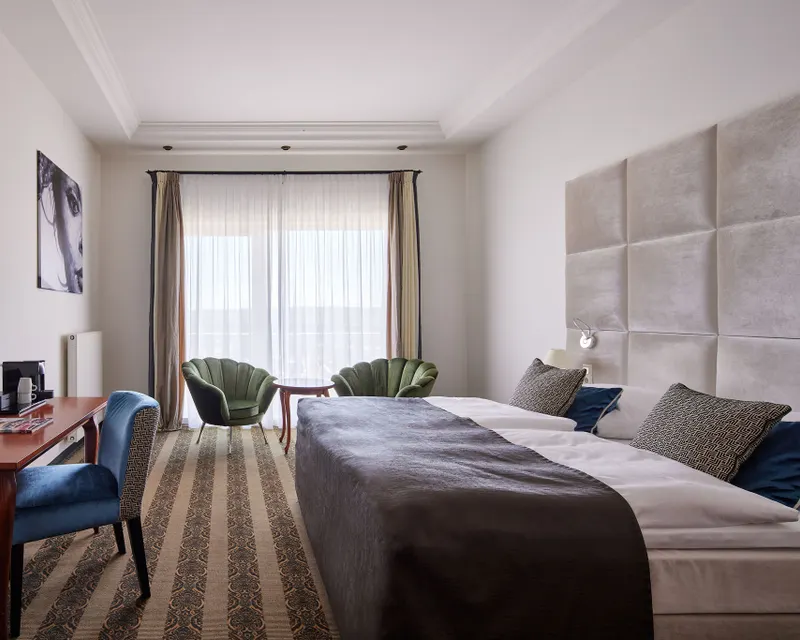 The spacious and stylishly furnished room (approx. 32 m²) includes a large box spring bed, desk, comfortable seating, balcony, Nespresso coffee machine incl. capsule mix as welcome, wardrobe, suitcase rack, free WiFi, telephone, flat-screen TV with international programs, a safe and air conditioning.